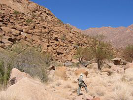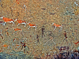The White Lady is a rock painting, located on a panel, also depicting other art work, on a small rock overhang, deep within Brandberg Mountain. The giant granite monolith located in Damaraland and called 'The Brandberg' is Namibia's highest mountain. The painting's German name is Weiße Dame.