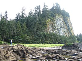 Tow Hill is a large isolated volcanic plug located 21 km east of Masset on the north end of the Naikoon Peninsula of northeast Graham Island in Haida Gwaii, British Columbia, Canada, east of McIntyre Bay and near the mouth of the Hiellen River, which is the site of Hiellen, a now-abandoned Haida village and of the Hiellen Indian Reserve No. 2, on the site of that village. Formerly Tow Hill Provincial Park, it is now part of Naikoon Provincial Park, which covers most of the northeastern flatland of Graham Island.