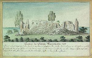 Viļaka Castle is a castle in the historical region of Latgale, in eastern Latvia. The castle is located close to Viļaka town, on an island in the Viļaka Lake. Built by Archbishopric of Riga in 1342 as a wooden castle, rebuilt as a stone castle after 1516. The castle was destroyed in 1702 during the Great Northern War. The outer walls are 1.6m thick, remaining fragments of the walls are up to 2 meters high.