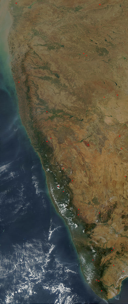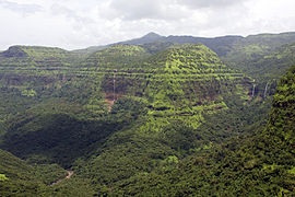 The Western Ghats, also the "Sahyadri" , is a mountain range that covers an area of 160,000 square kilometres in a stretch of 1,600 kilometres parallel to the western coast of the Indian peninsula, traversing the states of Tamil Nadu, Kerala, Karnataka, Goa, Maharashtra and Gujarat. It is a UNESCO World Heritage Site and is one of the eight hot-spots of biological diversity in the world. It is sometimes called the Great Escarpment of India. It contains a very large proportion of the country's flora and fauna, many of which are only found in India and nowhere else in the world. According to UNESCO, the Western Ghats are older than the Himalayas. They influence Indian monsoon weather patterns by intercepting the rain-laden monsoon winds that sweep in from the south-west during late summer. The range runs north to south along the western edge of the Deccan Plateau, and separates the plateau from a narrow coastal plain, called Konkan, along the Arabian Sea. A total of thirty-nine areas in the Western Ghats, including national parks, wildlife sanctuaries and reserve forests, were designated as world heritage sites in 2012 – twenty in Kerala, ten in Karnataka, six in Tamil Nadu and four in Maharashtra.