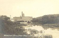 The Worumbo Mill was a historic mill on the bank of the Androscoggin River in Lisbon Falls, Maine. Founded in 1864, it was at one point the community's largest employer. Its main building, dating to its founding, was destroyed by fire in 1987. The complex was listed on the National Register of Historic Places in 1973, and was delisted in 2017.
