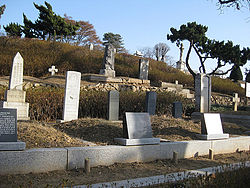 Yanghwajin Foreign Missionary Cemetery , also known as the Hapjeong-dong International Cemetery, is a cemetery overlooking the Han River in the district of Mapo-gu, Seoul, South Korea. Designated in 1890 as a site for foreign missionaries by King Gojong, the site is currently open to the public from 9:00am to 6:00pm and is located next to Jeoldusan Martyr's Shrine. It is estimated that approximately 30,000 Koreans and 500 foreign nationals visit every year.